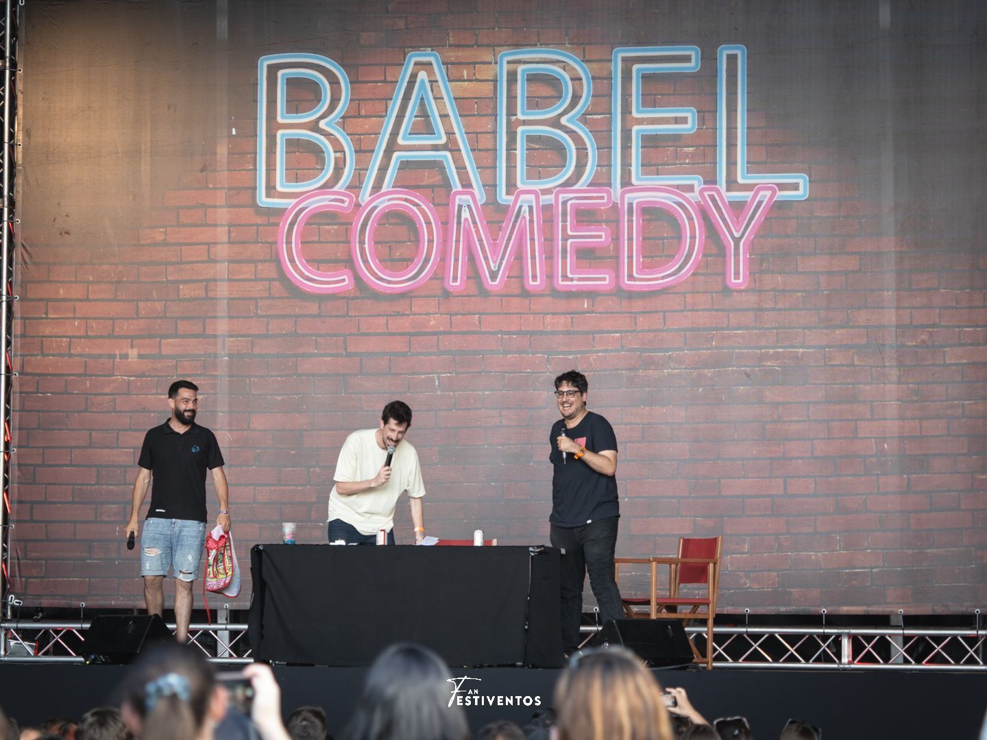 La entrada al recinto se hizo de rogar entre alguna que otra pequeña confusión y el largo zigzag que forman las vayas para conseguir la ansiada pulsera. Pero por fin, tras cruzar el puente sobre el río Manzanares, llegué a la inmensa esplanada dividida en dos escenarios, la zona de restaurantes y las carpas alternativas del festival: la del Babel Comedy, por donde pasaron La Ruina, Lalachus, La pija y la kinki y Ana Morgade, entre otros muchos cómicos.
